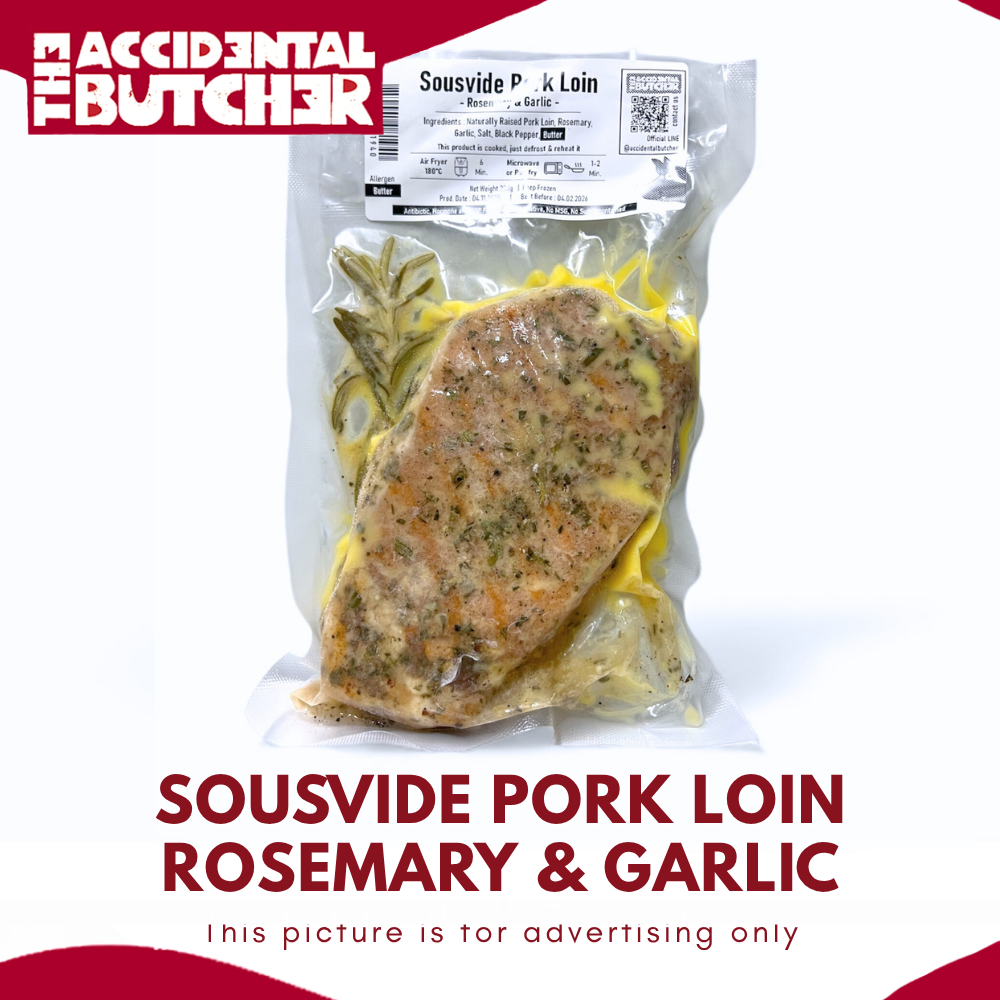 - Sousvide Pork Loin Steak - Rosemary & Garlic Made from hormone-free pork loin, seasoned with rosemary and garlic. The pork is cooked using the Sous-vide technique — a slow, low-temperature cooking process in a vacuum-sealed bag. This method ensures the meat is evenly cooked, tender, and juicy while retaining its natural moisture and aroma.